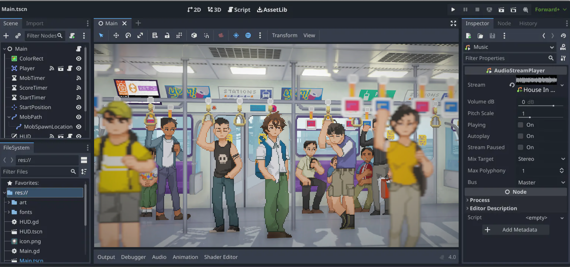 Use building blocks called nodes to create more complex and reusable scenes. Add scripts to your scenes and customize